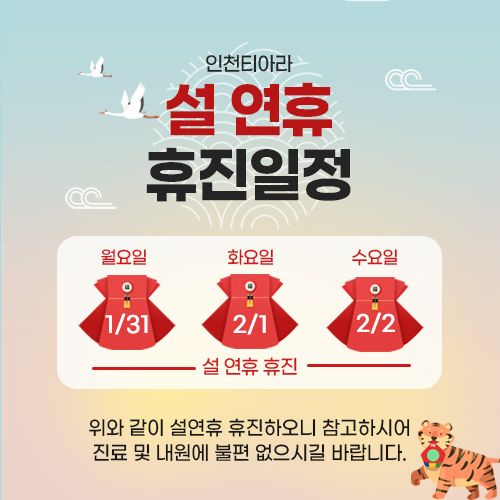 인천티아라 설 연휴 휴진 안내 페이지 정보 작성자 관리자 작성일22-01-27 11:59 조회3,028회 댓글0건 관련링크 이전글 다음글 목록 본문 인천티아라 설 연휴 휴진 안내드립니다. 댓글목록 등록된 댓글이 없습니다. 이전글 다음글 목록