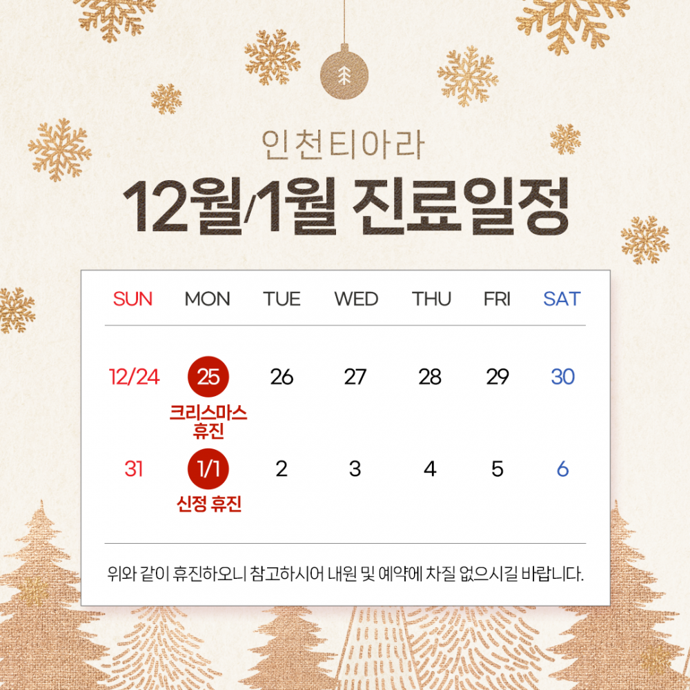 인천티아라 12월/1월 진료일정 안내 페이지 정보 작성자 관리자 작성일23-12-14 09:27 조회2,899회 댓글0건 관련링크 이전글 다음글 목록 본문 인천티아라 12월/1월 진료일정 안내 댓글목록 등록된 댓글이 없습니다. 이전글 다음글 목록