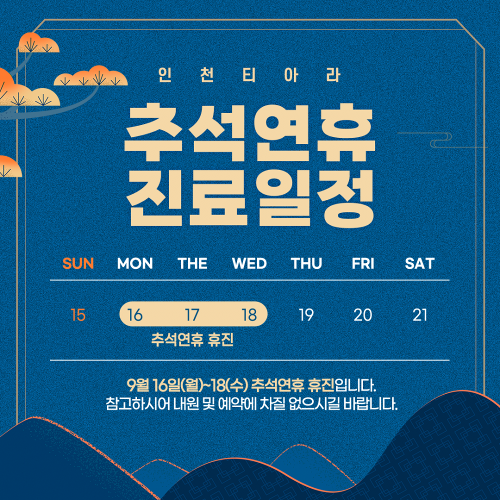 인천 티아라 9월 진료일정 안내 페이지 정보 작성자 관리자 작성일24-08-30 08:47 조회3,122회 댓글0건 관련링크 이전글 다음글 목록 본문 추석 연휴기간 16일-18일 추석 휴진이므로 예약 및 내원에 차질없으시길 바랍니다 :) 댓글목록 등록된 댓글이 없습니다. 이전글 다음글 목록