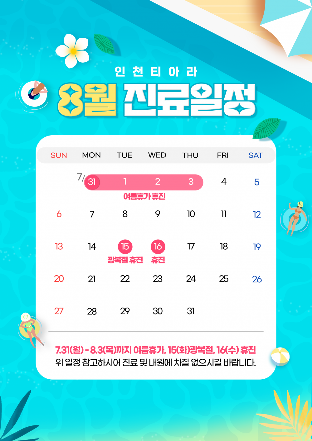 인천티아라 8월 진료일정 안내 페이지 정보 작성자 관리자 작성일23-07-27 15:50 조회3,204회 댓글0건 관련링크 이전글 다음글 목록 본문 인천티아라 8월 진료일정 안내드립니다. 댓글목록 등록된 댓글이 없습니다. 이전글 다음글 목록