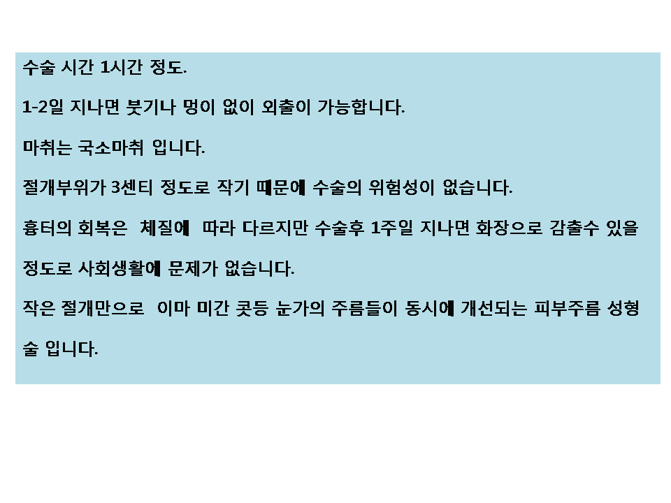 최소절개 얼굴 주름 성형술 소개 페이지 정보 작성자 관리자 작성일17-07-19 11:43 조회4,484회 댓글0건 관련링크 이전글 다음글 목록 글쓰기 본문 수술 시간 1시간 정도 수술 다음날 외출 가능 주름 성형후 유지기간은 반 영구적입니다 댓글목록 등록된 댓글이 없습니다. 이전글 다음글 목록 글쓰기