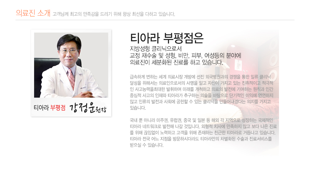 인천시 부평구 부평 1동 199-24번지 티아라 의원 성형 클리닉 Tel.032.508.7767-8 대표자 : 강정운 E-mail:drkang24@naver.com copyright(c)Tiara clinic All right reserved. 비급여 항목 안내